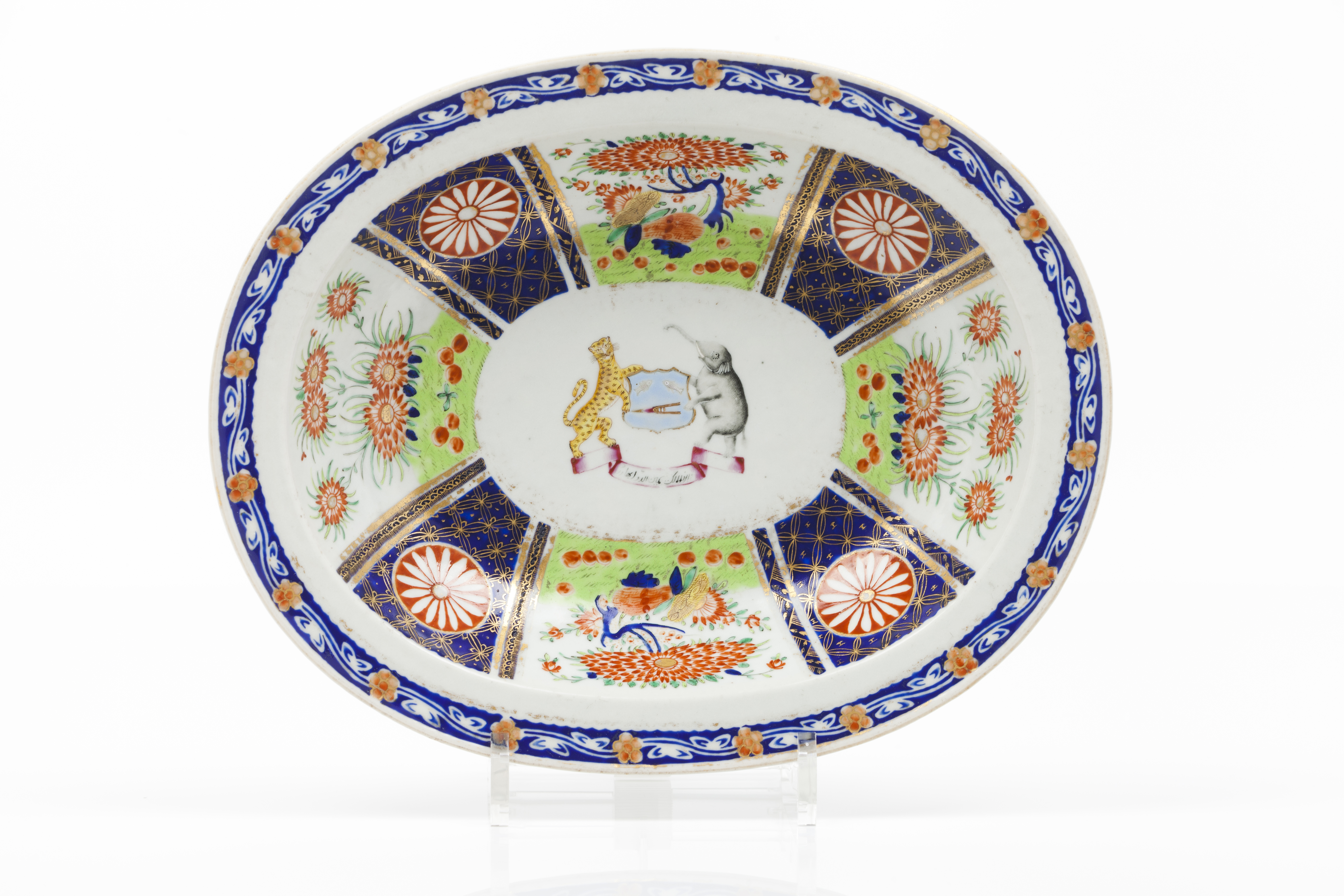 Com decoração policromada representando ao centro brasão com chita, elefante e cartela com inscrição