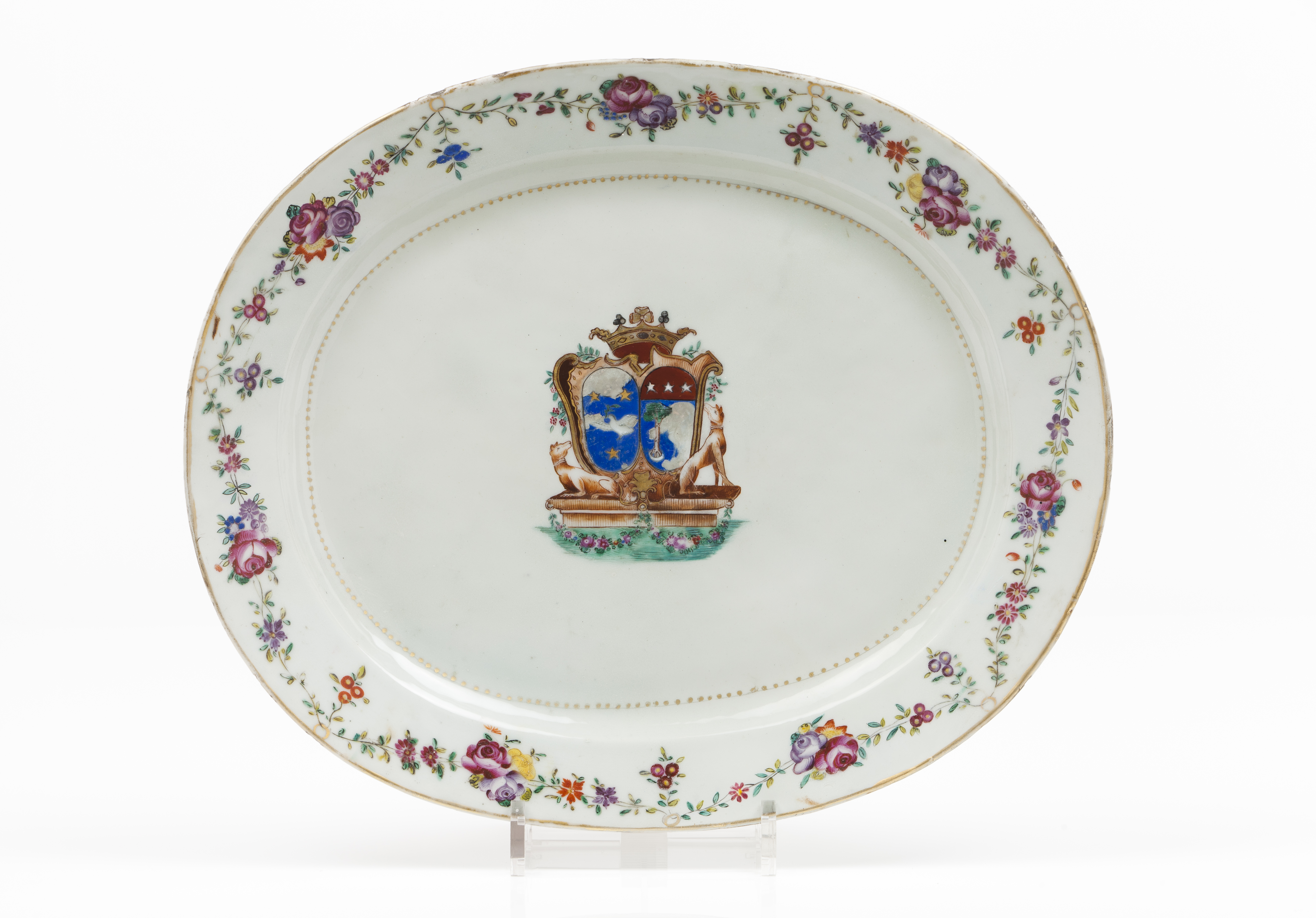 Decorada com esmaltes da Família Rosa representando ao centro armas de família europeia