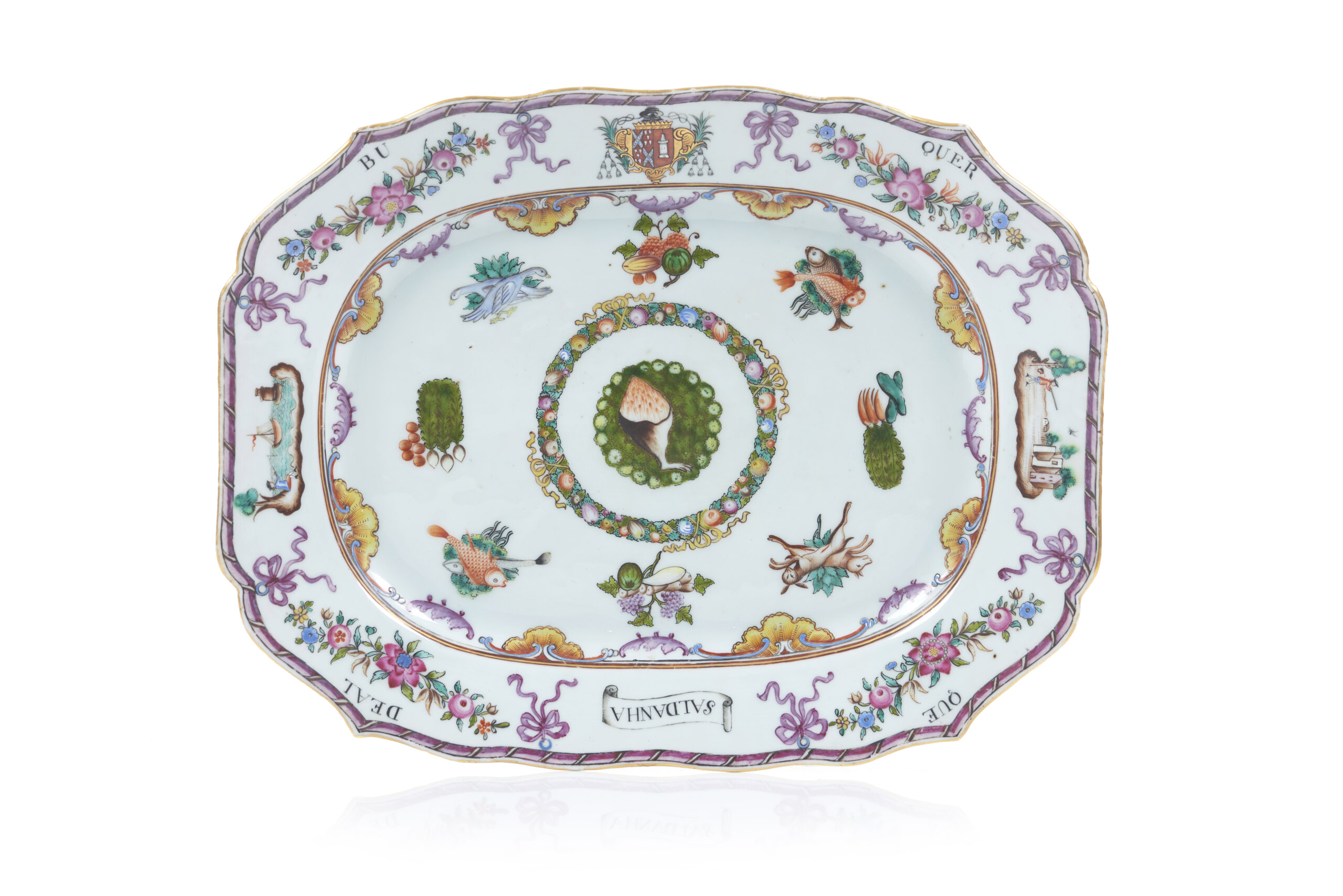 Decorada com esmaltes da Família Rosa e dourado, apresentando ao centro um medalhão com perna de animal sobre fundo vegetalista, enquadrado por grinalda de flores e composições de frutos, legumes e motivos alusivos à caça e pesca