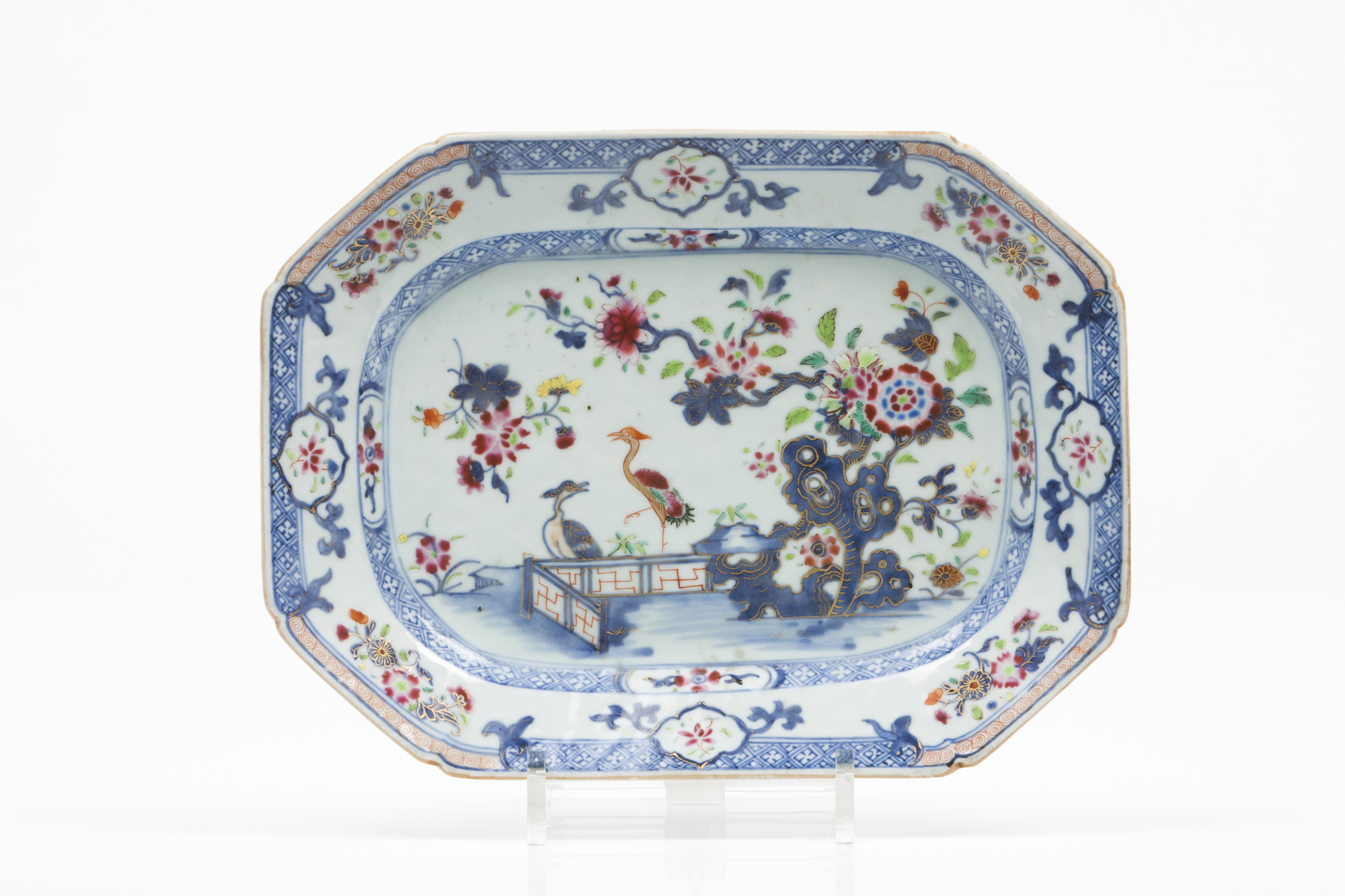 Decoração a azul sob vidrado e com esmaltes da Família Rosa representando vista de jardim com garças