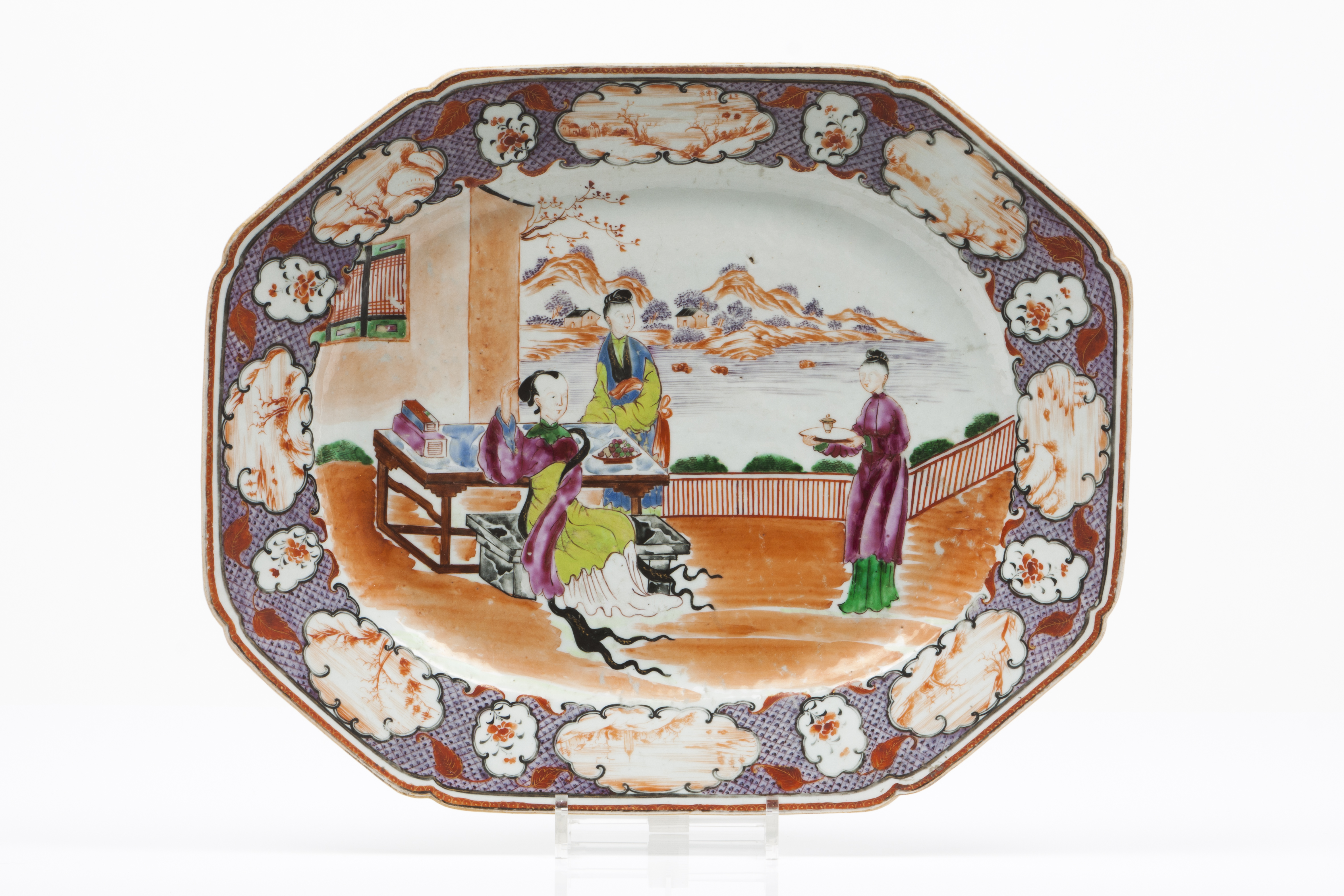 Bordo de fundo escamado com reservas a rouge-de-fer com paisagens
