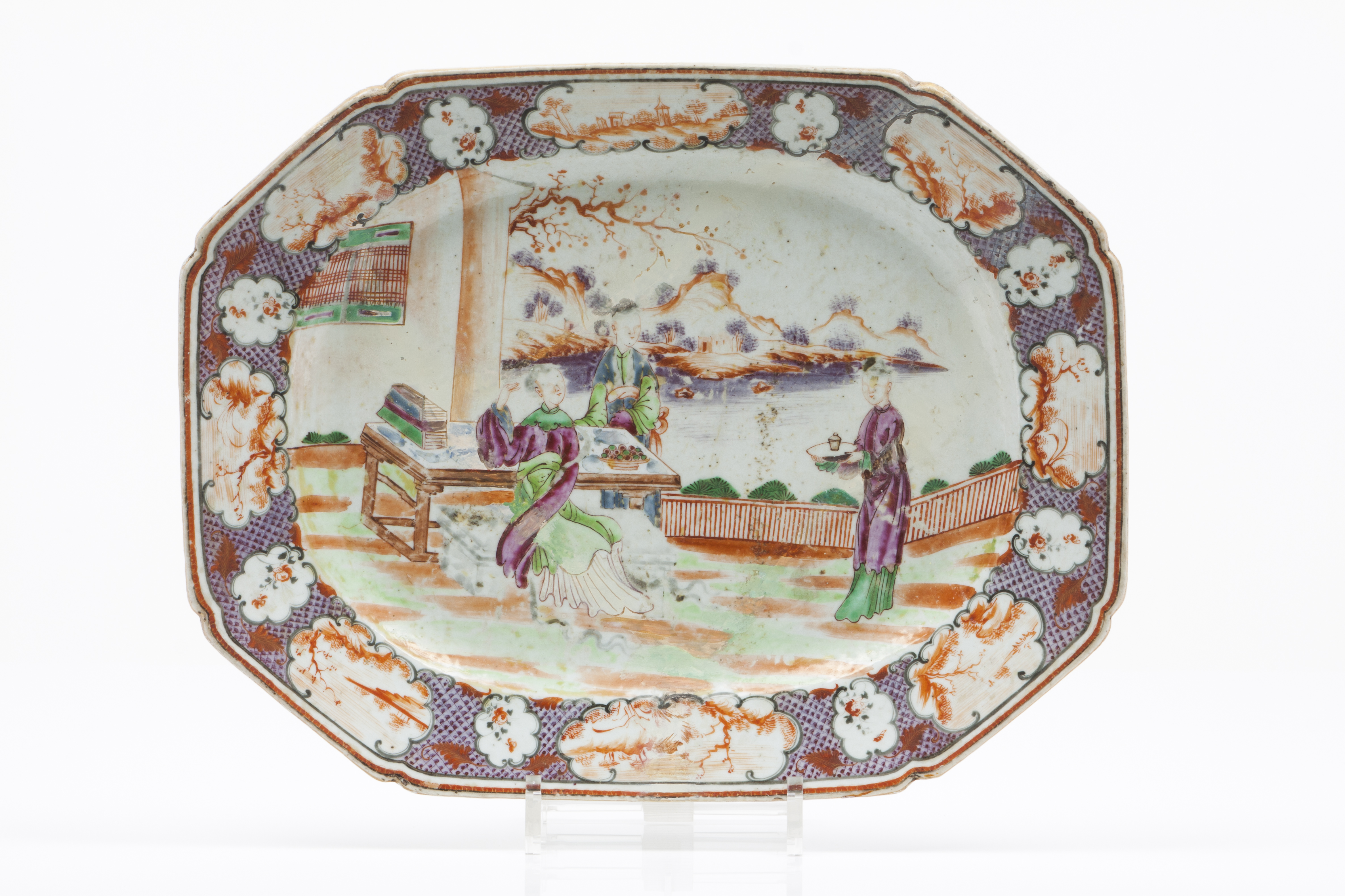 Bordo de fundo escamado com reservas a sépia com paisagens