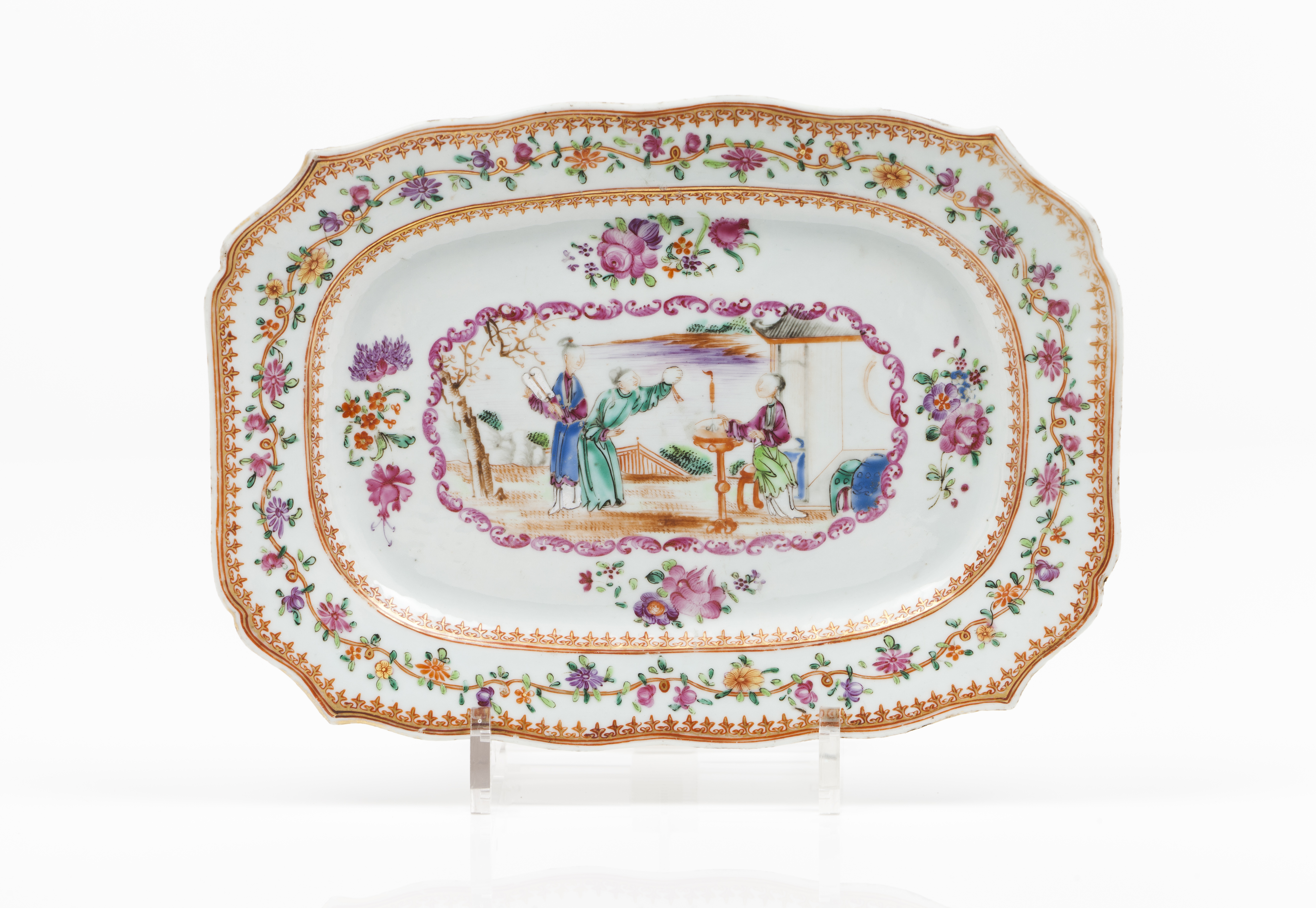 Decoração policromada e dourada com esmaltes da Família Rosa, representando flores e figuras orientais ao centro