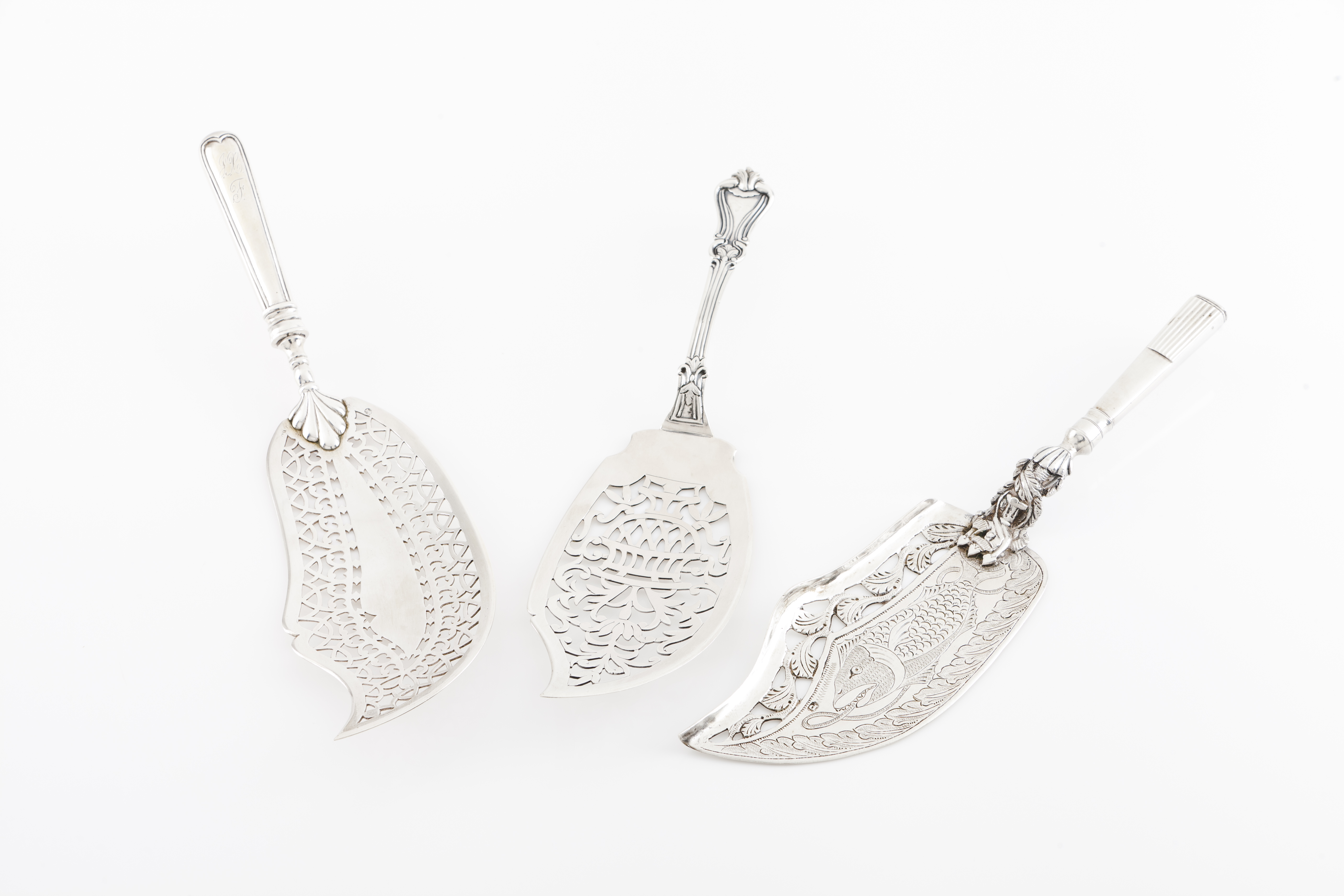 Pás com decoração vazada e cinzelada e cabos trabalhados com vincos e motivos vegetalistas relevados