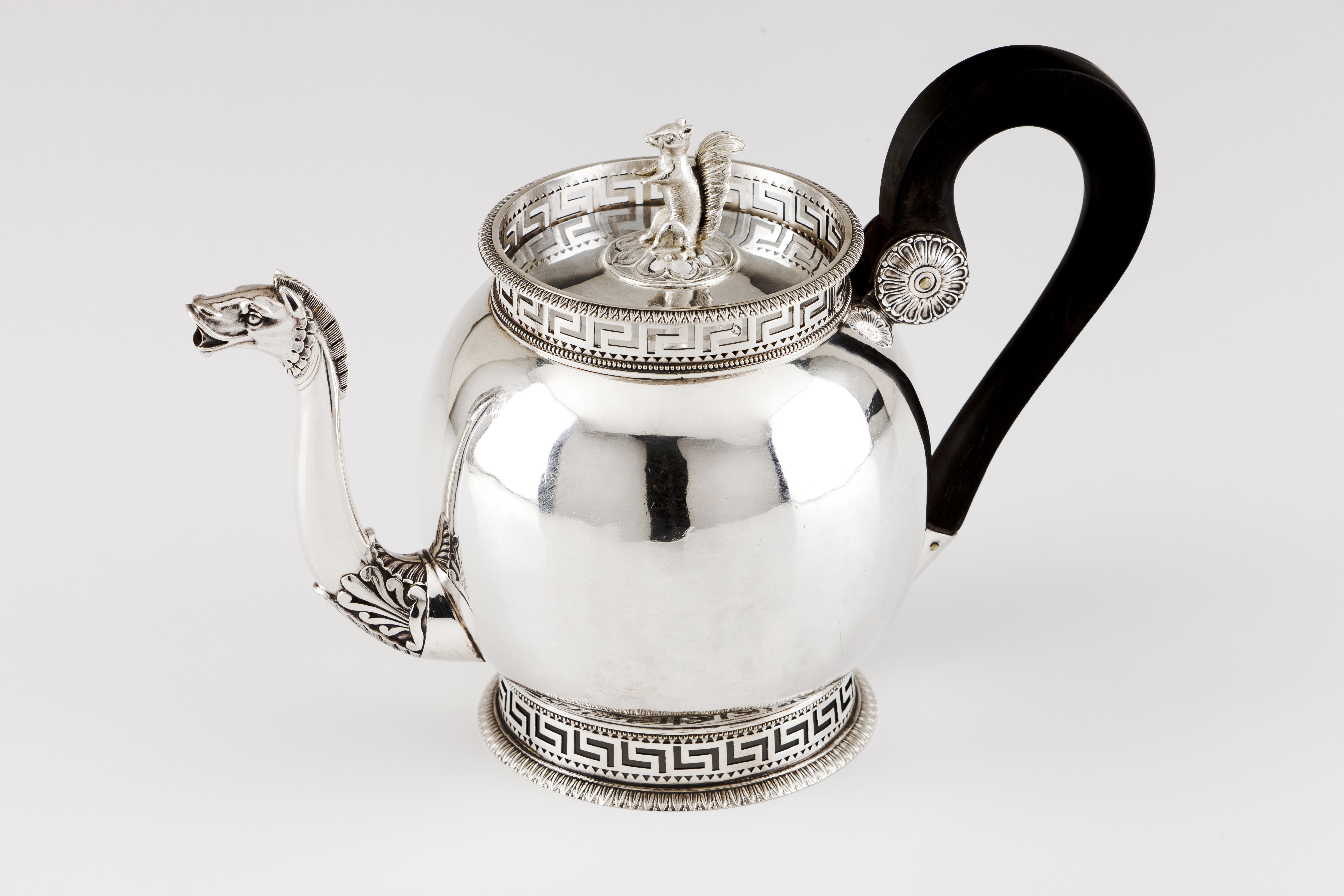 Decoração de friso de Gregas o bico com motivos de palmetas e cabeça de cavalo. Alavanca da tampa em formato de esquilo e pega em madeira escurecida