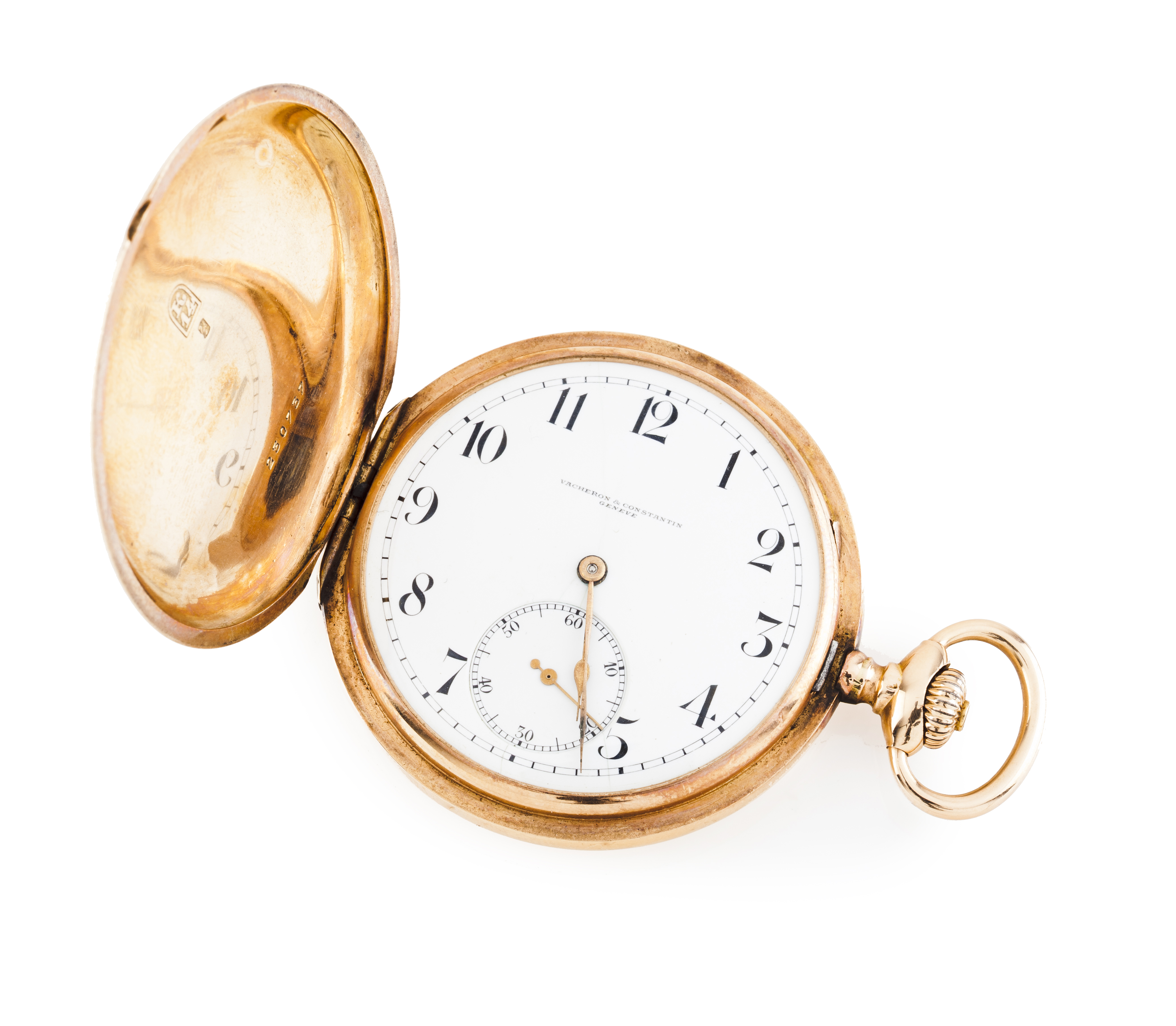 Relógio de Bolso, modelo caçador. Movimento mecânico de corda manual com regulação e Nº de série 374231. Caixa em ouro (575/000) com três tampas. Mostrador com numeração árabe. Com marcas de uso.