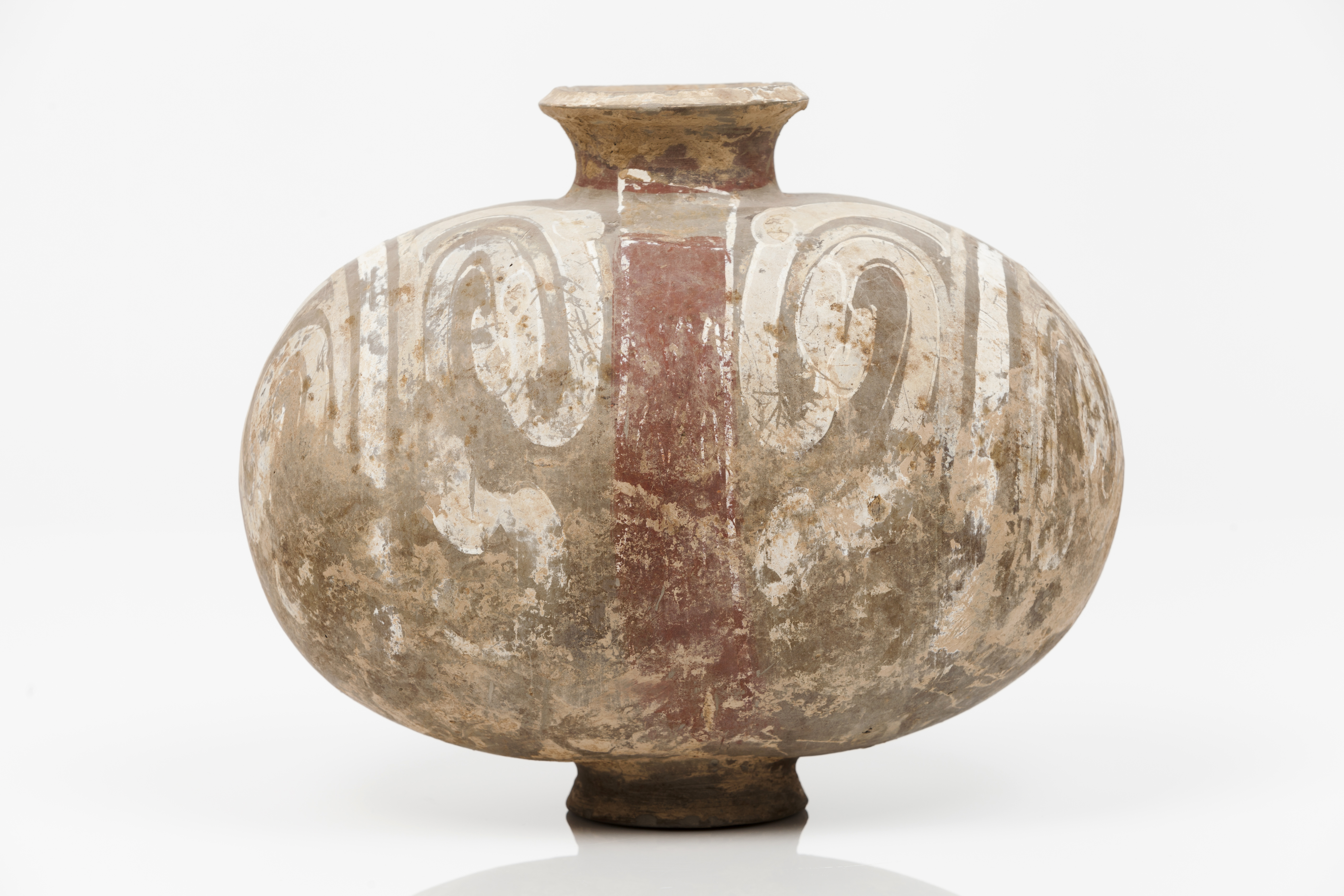 Decorado com desenho espiralado em tons de ocre, vermelho e branco