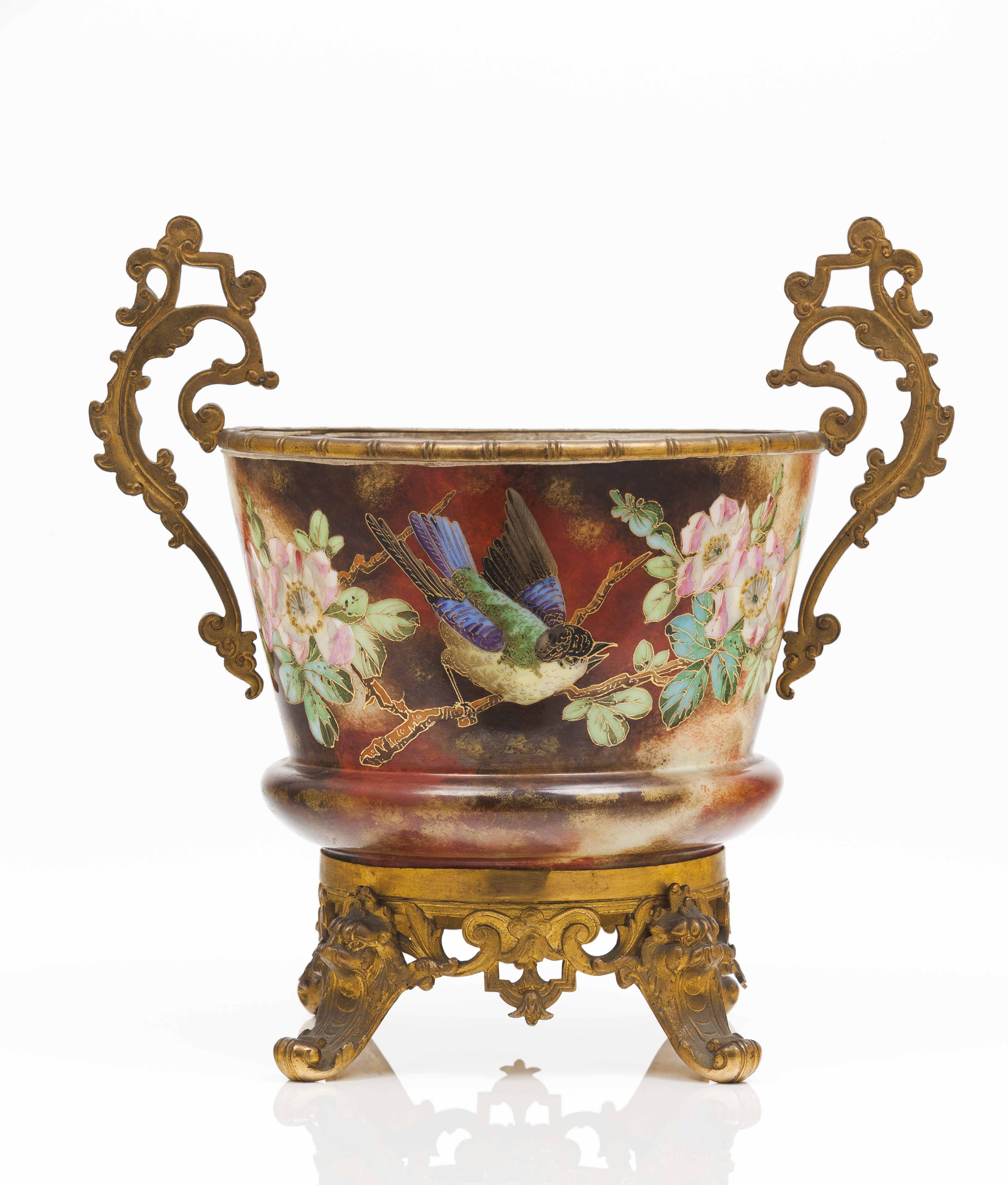 Em vidro com decoração policromada e dourada representando flores e pássaro