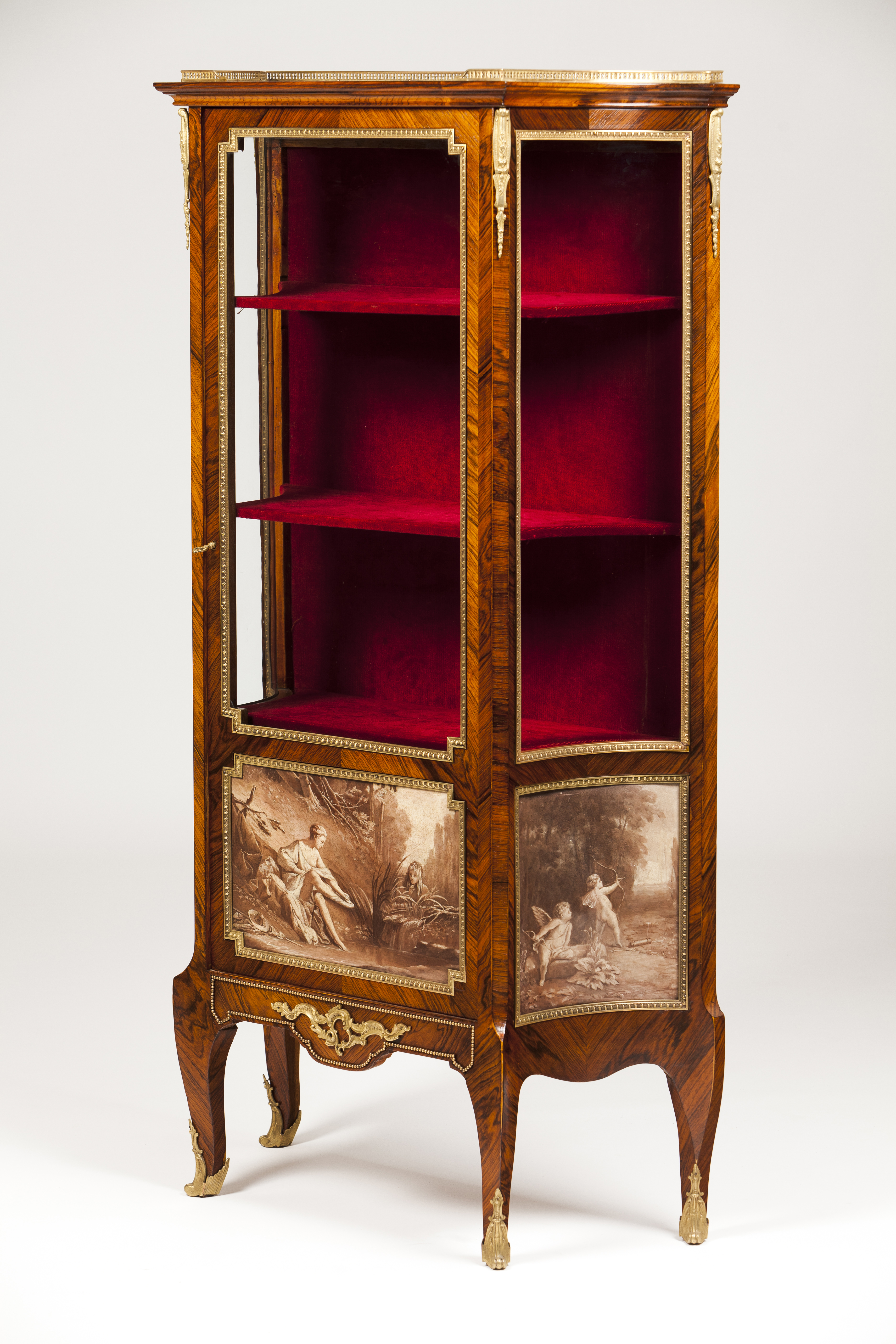 Decorada com painéis a óleo, representando cenas mitológicas, em tons de sépia