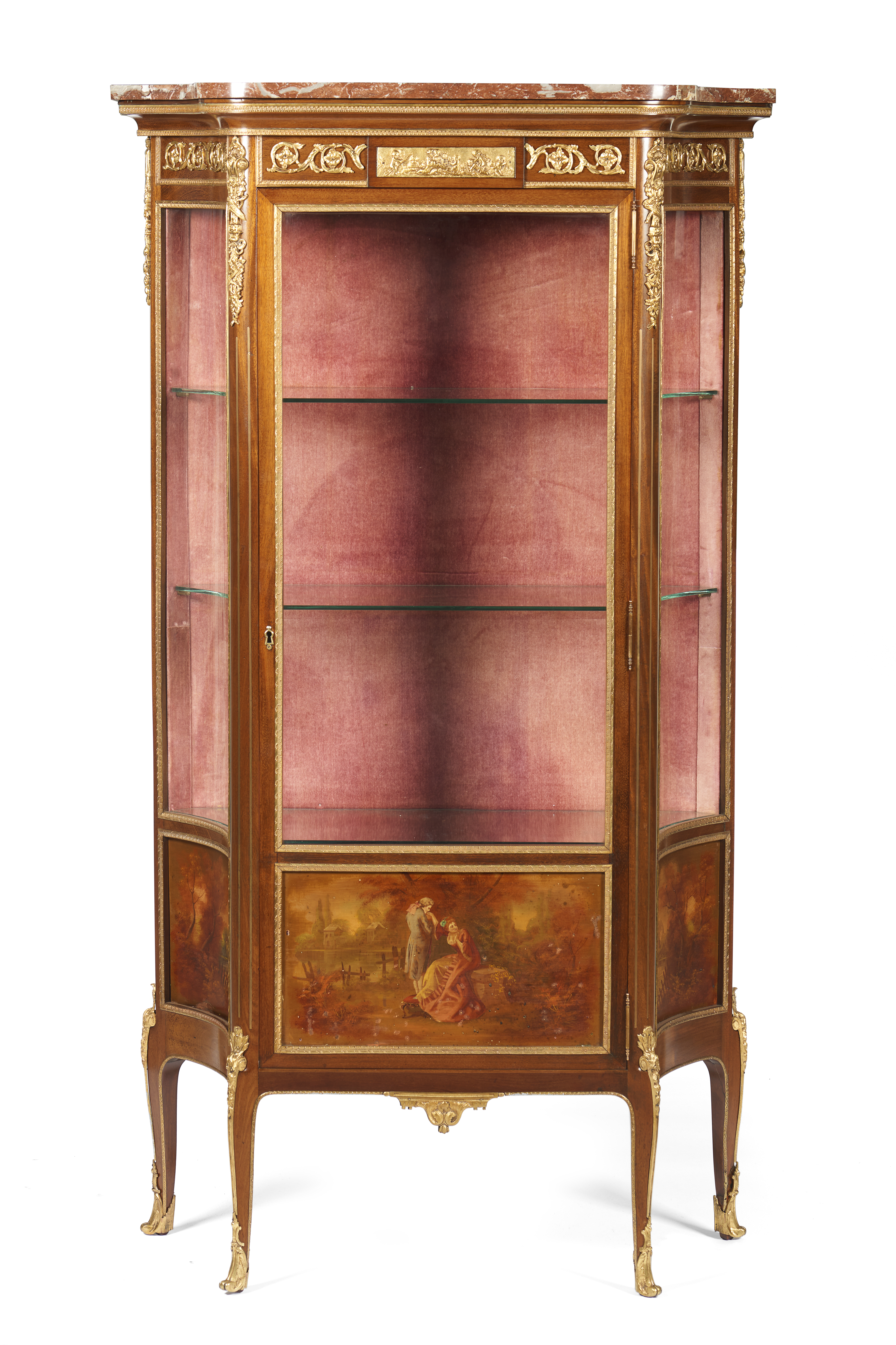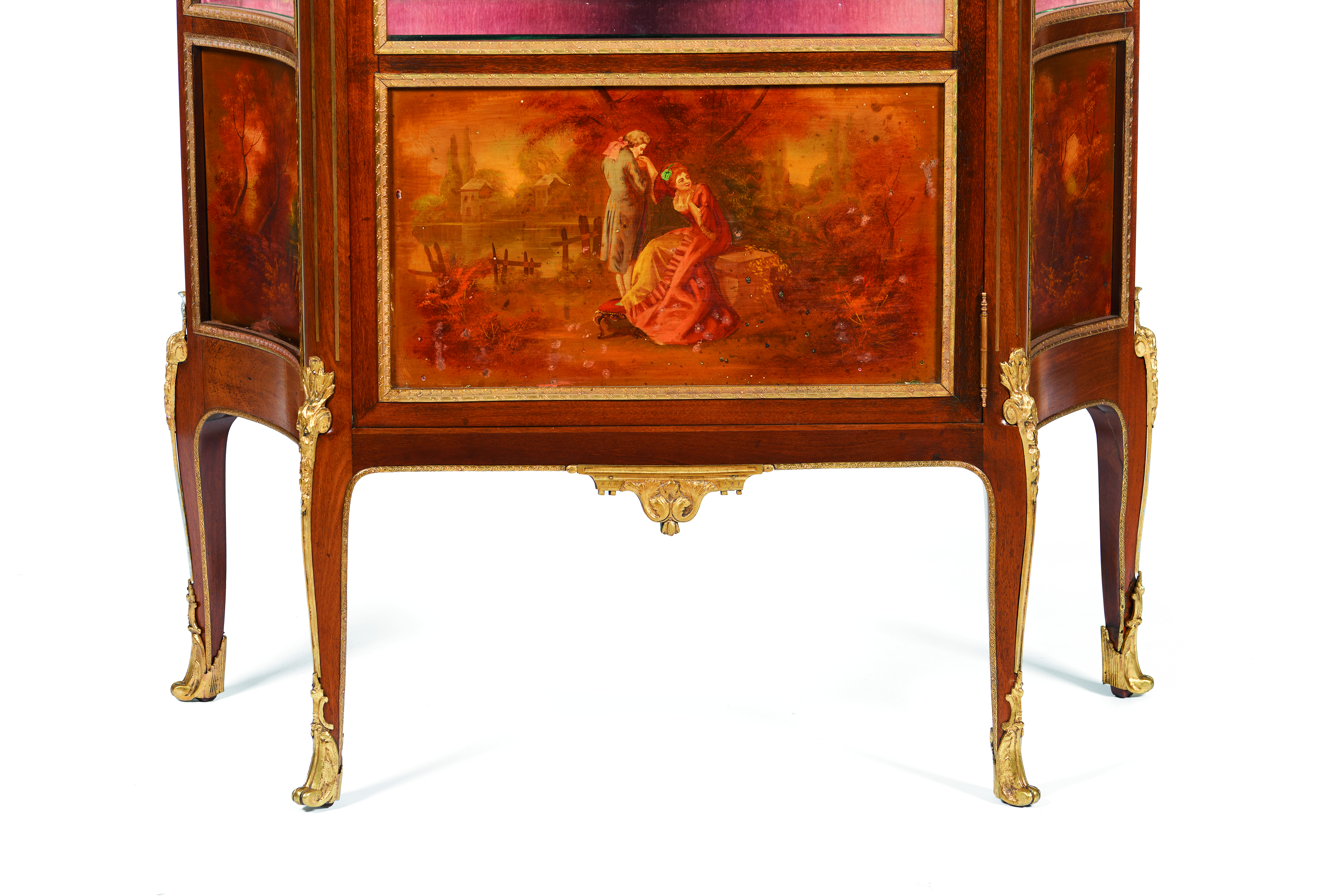 Decorada com três painéis em 'vernis Martin' representando cena galante e paisagens